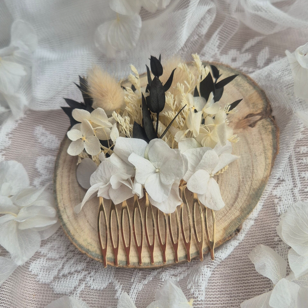 Ce peigne délicat est une véritable composition florale miniature, pensé pour sublimer une coiffure de mariée ou de cérémonie avec douceur et raffinement.