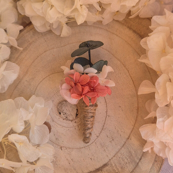 Confectionnée à la main, cette boutonnière associe délicatement de l’eucalyptus et des hortensias stabilisés dans des tons beige, blanc et vieux rose pour un style bohème chic intemporel.
