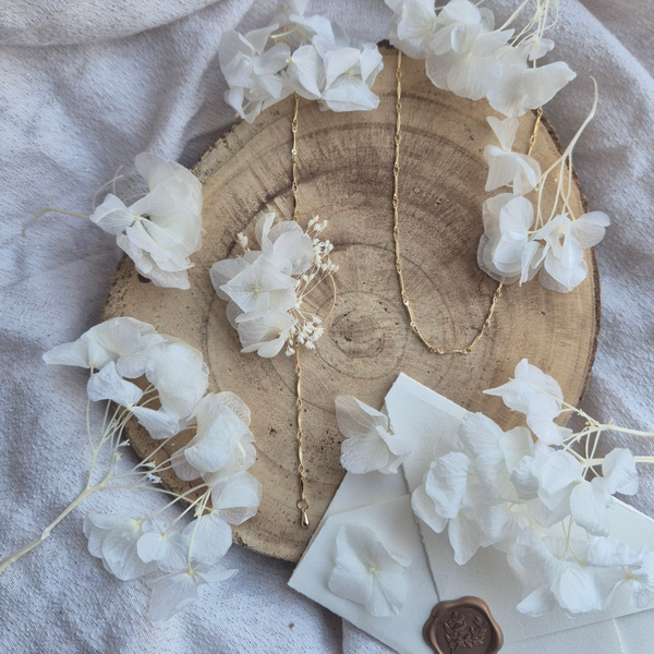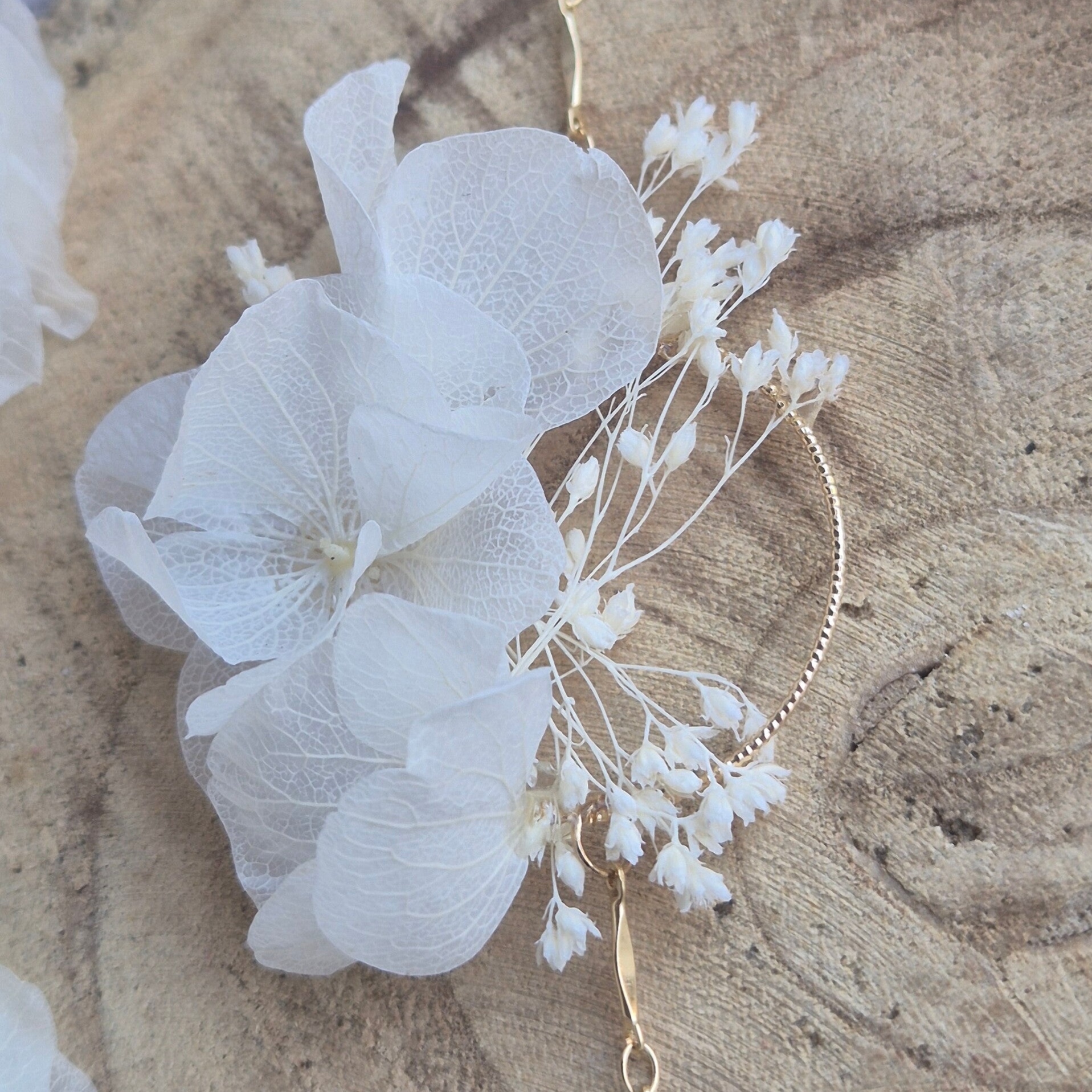 Ce collier de dos est composé d’une chaîne en acier inoxydable doré à l’or fin, ornée de fleurs d’hortensia stabilisées et d’un feuillage blanc pour un rendu poétique et élégant.