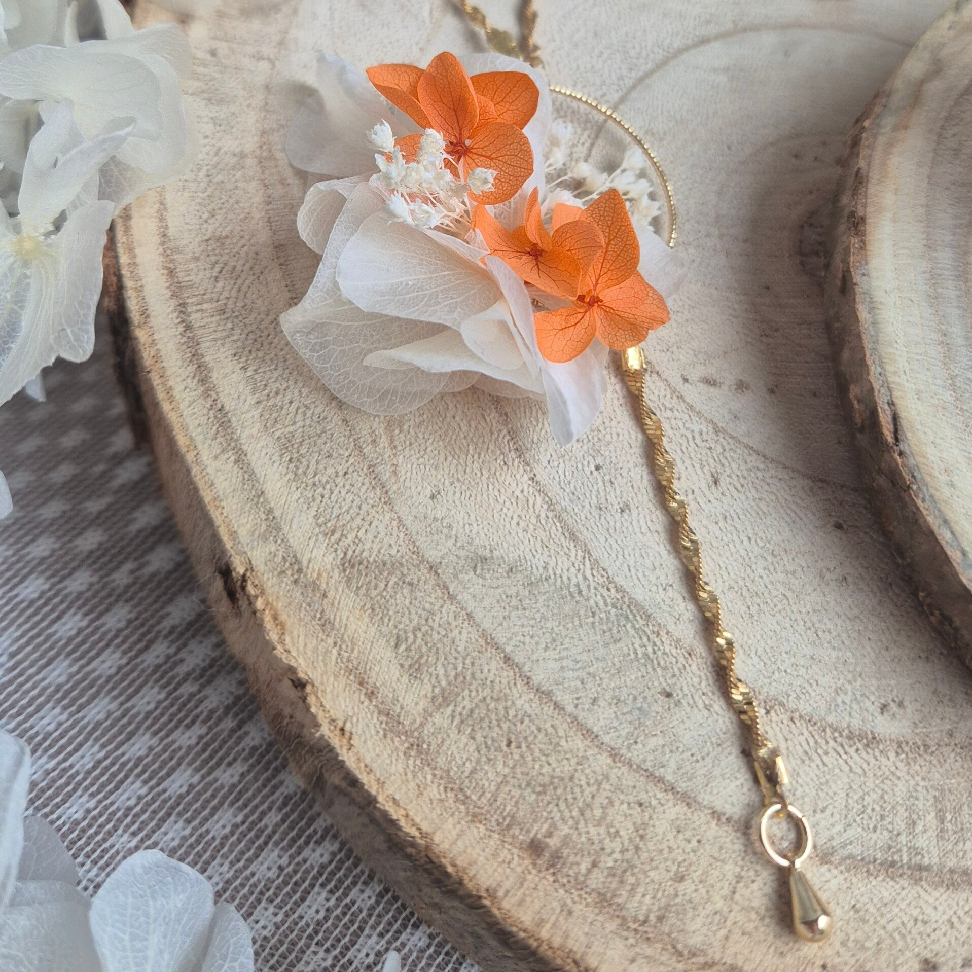 Les fleurs stabilisées conservent leur éclat et leur texture naturelle dans le temps, sans entretien particulier. Chaque pièce étant réalisée avec de véritables pétales, votre collier est unique.