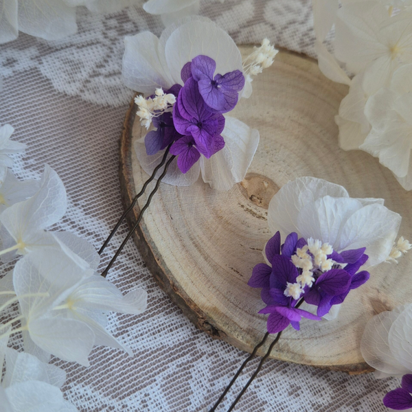 Apportez une touche d’élégance et de romantisme à votre coiffure avec ce lot de 3 magnifiques pics à chignon ornés de fleurs d’hortensia stabilisées dans des tons violet et blanc. Idéals pour un mariage, ces accessoires délicats subliment aussi bien une coiffure de mariée qu’une coiffure de demoiselle d’honneur.